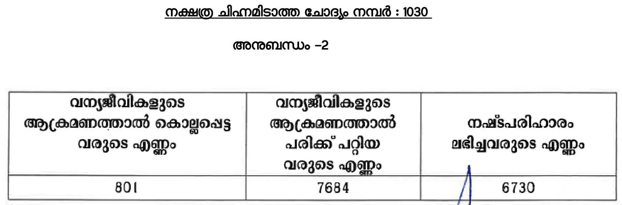 ഈ കാലയളവിൽ വന്യജീവികളുടെ ആക്രമണത്തിൽ 801 പേർക്ക് ജീവഹാനി സംഭവിച്ചു. വന്യജീവികളുടെ ആക്രമണത്തിൽ 7684 പേർക്ക് പരിക്കേറ്റു. നഷ്ടപരിഹാരം ലഭിച്ചവർ 6730 ആണ്. 954 പേർക്ക് നഷ്ടപരിഹാരവും നൽകിയിട്ടില്ല.