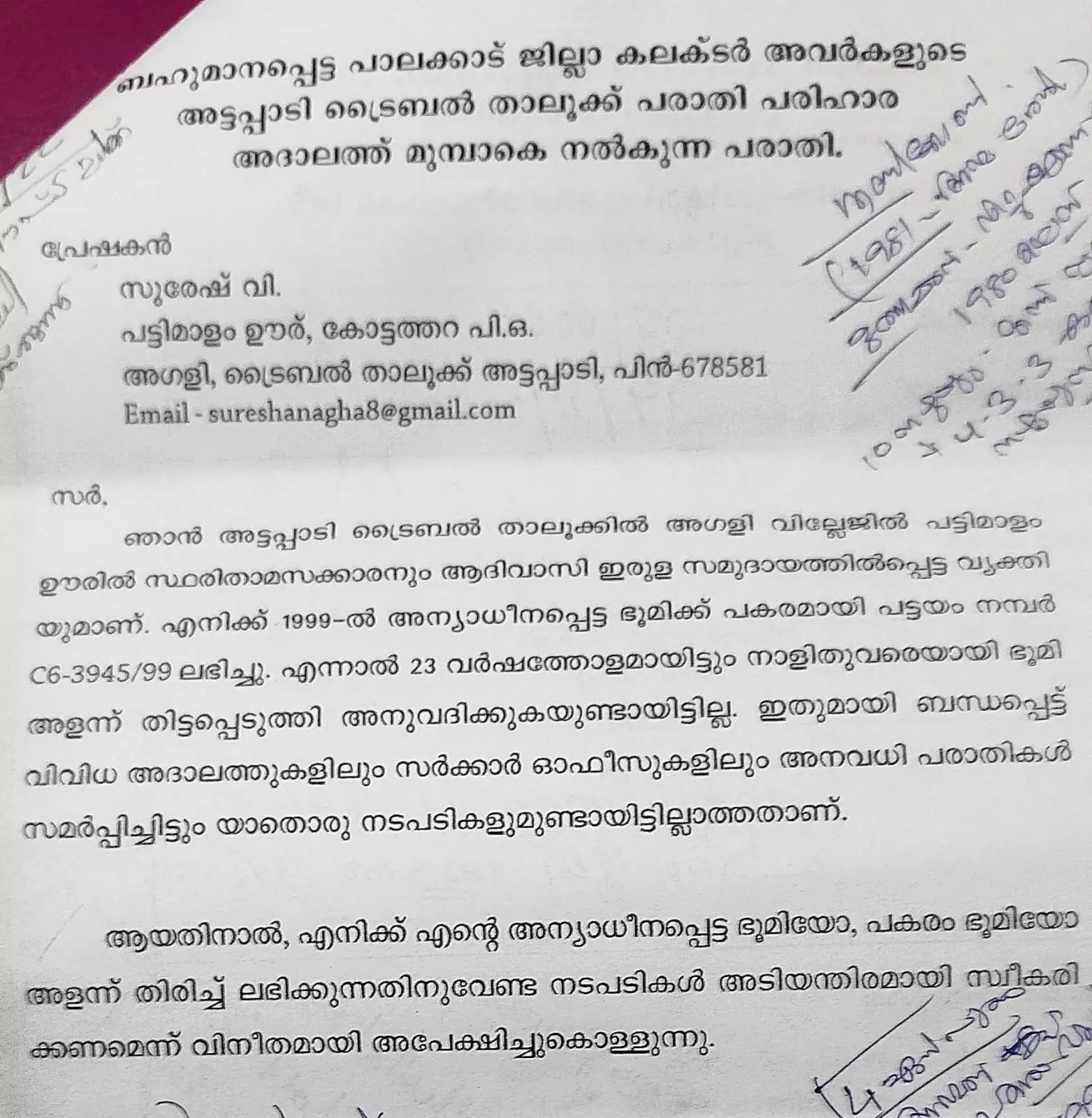 പാലക്കാട് കലക്ടർ മൃൺ മയി ജോഷി ഡിസംബർ 17 ന് അട്ടപ്പാടിയിൽ നടത്തിയ അദാലത്തിലും സുരേഷ് പരാതി നൽകി. അന്യാധീനപ്പെട്ട ഭൂമിയോ പകരം ഭൂമിയോ അളന്നുതിരിച്ച് ലഭിക്കുന്നതിന് വേണ്ട നടപടി സ്വീകരിക്കണമെന്നാണ് അദ്ദേഹം പരാതിയിൽ ആവശ്യപ്പെട്ടത്. തുടർനടപടിക്കായി കലക്ടർ പരാതി അട്ടപ്പാടി താലൂക്ക് തഹസിൽദാർക്ക് കൈമാറി. തഹസിൽദാർ എന്നെങ്കിലും ഭൂമി കണ്ടെത്തി നൽകുമെന്ന് ആർക്കും വിശ്വാമില്ല.