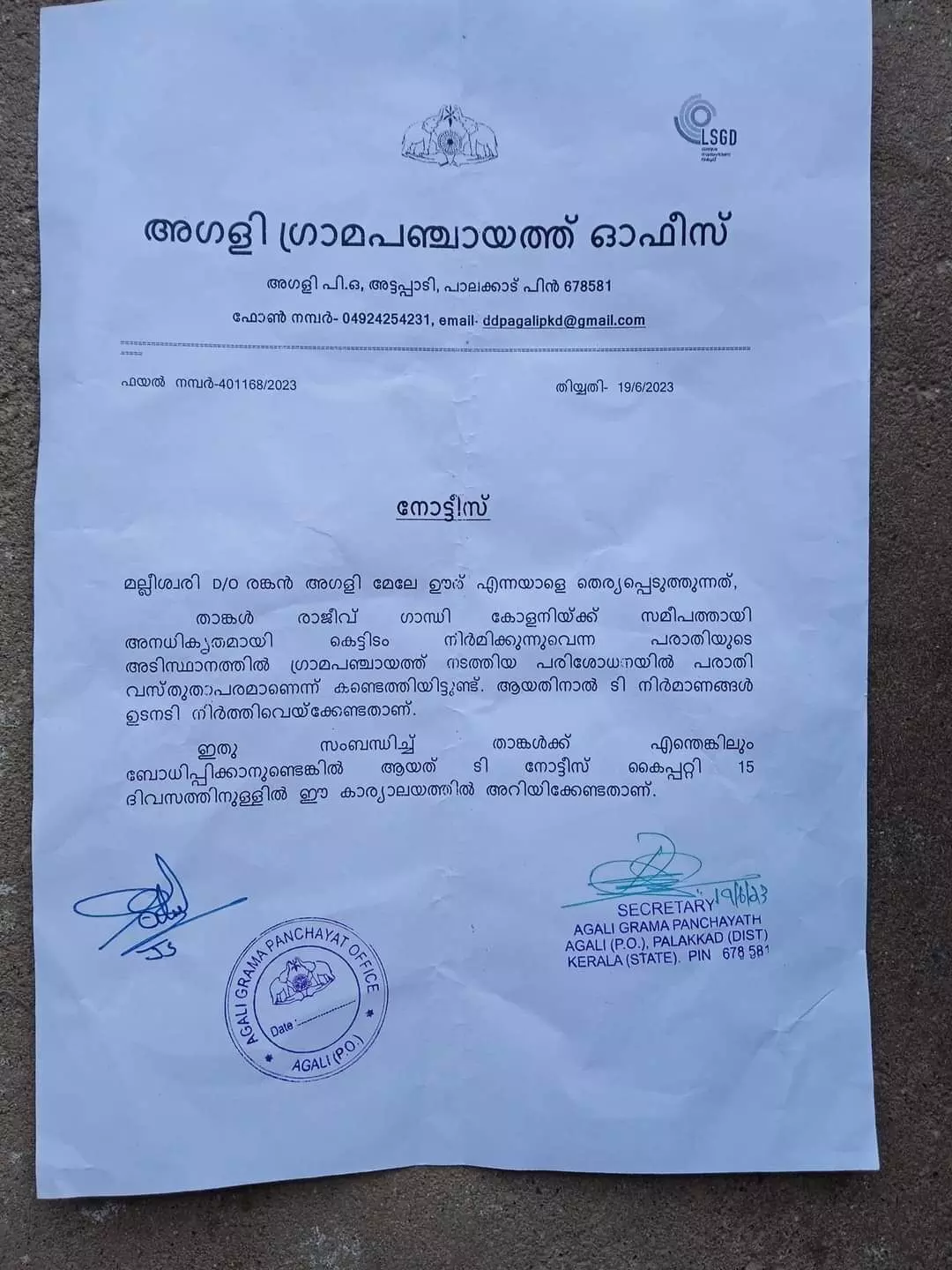 സർക്കാർ സഹായത്തോടെ വീട് നിർമിക്കുന്നത് അടിസ്ഥാനം നിർമിക്കുമ്പോഴാണ് അഗളി ഗ്രാമപഞ്ചായത്ത് സ്റ്റോപ്പ് മെമ്മോ നൽകിയത്. അതാനിയ ഗ്രാമപഞ്ചായത്ത് സെക്രട്ടറി നേരിട്ട് എത്തിയിരുന്നു. ഇതിന് ശേഷം രാത്രി വീടിനുള്ള അടിസ്ഥാനം നിർമിക്കുന്നതിന് കുഴിച്ച സ്ഥലം മണ്ണിട്ട് മൂടി. പൊലീസിനെ ഉപയോഗിച്ച് ഭയപ്പെടുത്തിയാലും പിൻവാങ്ങില്ലെന്ന് മല്ലീശ്വരി പറഞ്ഞു.