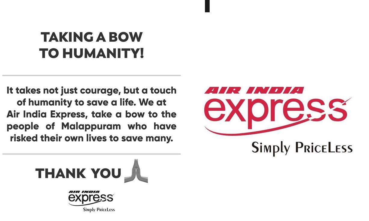 ഇത് കേവലം ധൈര്യത്തിൻെറ മാത്രം കാര്യമല്ല, മാനവികതയുടെ സ്പർശനമാണ്. മറ്റുള്ളവരുടെ ജീവൻ രക്ഷിക്കാനായി സ്വന്തം ജീവൻ പണയം വെച്ച മലപ്പുറത്തുകാർക്ക് ഞങ്ങൾ അഭിവാദ്യമാർപ്പിക്കുന്നു -എയർ ഇന്ത്യ എക്സ്പ്രസ് ഫേസ്ബുക് പേജിൽ കുറിച്ചു.