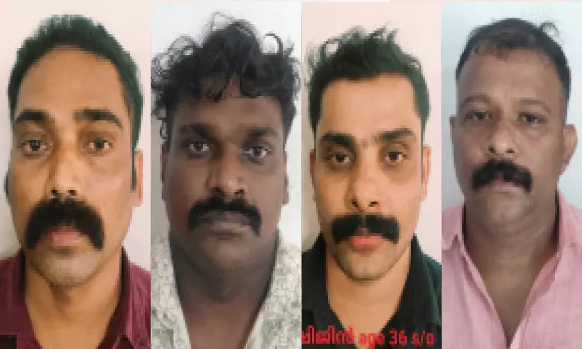 കണ്ണൂർ കാടാച്ചി പഴയപുരയിൽ പ്രജേഷ് (42), ആലപ്പുഴ കായംകുളം പേരൂർ തെക്കേതിൽ രഞ്ജിത് (34), കണ്ണൂർ കൂത്തുപറമ്പ് മാനന്തേരി പുത്തൻപുരയിൽ ഷിജിൻ (36), തിരുവനന്തപുരം കിളിമാനൂർ ചൂട്ടയിൽ വിഷ്ണുരാജ് (38) എന്നിവരാണ് പിടിയിലായത്. ഞായറാഴ്ച രാവിലെ ആറിനാണ് സംഭവം.