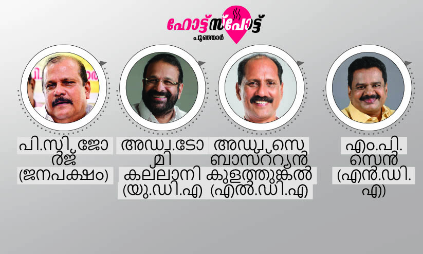 text_fieldsകോട്ടയം: ത്രികോണപ്പോരിന് പൂർണമായും പാകപ്പെട്ടിട്ടില്ലാത്ത രാഷ്ട്രീയ കേരളത്തിൽ ചതുഷ്കോണത്തിെൻറ ഹുങ്കാണ് പൂഞ്ഞാറിന്. കഥയും കഥാപാത്രങ്ങളും മാറിയെങ്കിലും കഴിഞ്ഞതവണ ഒറ്റയാനായി വിജയിച്ച പി.സി. ജോർജ് ഇത്തവണയും സ്വതന്ത്രവേഷമണിഞ്ഞതാണ് പൂഞ്ഞാറിനെ പ്രവചനാതീതമാക്കുന്നത്. ജോർജിനെ പിടിച്ചുകെട്ടാൻ അരയും തലയും മുറുക്കി മുന്നണികൾ രംഗത്തെത്തിയതോടെ റബർ തലപ്പുകൾ നിറയുന്ന മലയോരപോരാട്ടത്തിന് തീവ്രചൂട്.