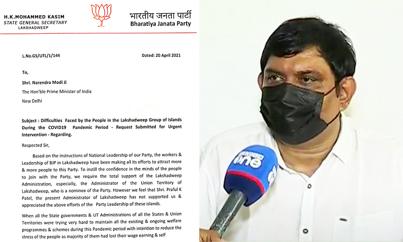അതേസമയം, അഡ്മിനിസ്ട്രേറ്റർക്കെതിരെ പ്രധാനമന്ത്രിക്ക് കത്തയച്ച പാർട്ടി ജനറൽ സെക്രട്ടറിയുടെ നടപടിയെ തള്ളി വൈസ് പ്രസിഡന്റ് രംഗത്തെത്തി. കാസിമിന്റെ കത്ത് നേതൃത്വം അറിഞ്ഞു കൊണ്ടല്ലെന്നും അഡ്മിനിസ്ട്രേറ്റർക്ക് പൂർണപിന്തുണ നൽകുന്നുവെന്നും കെ.പി. മുത്ത് മാധ്യമങ്ങളോട് പറഞ്ഞു.