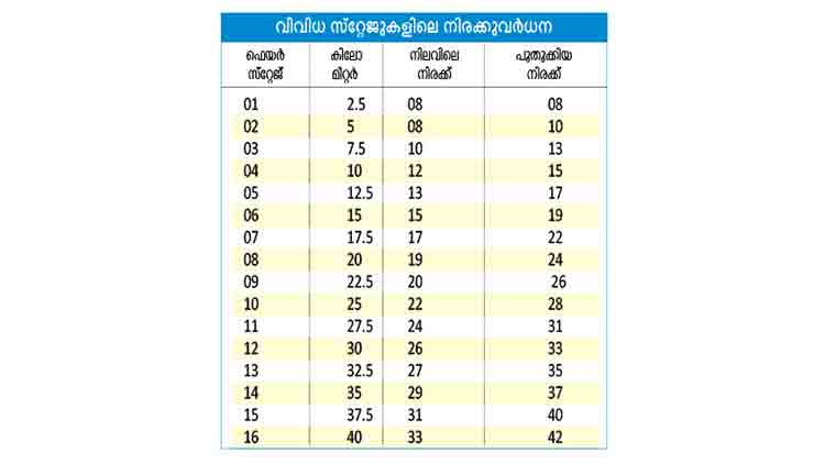 മിനിമം ചാർജ് വർധിപ്പിക്കാതെയും എന്നാൽ, മിനിമം ചാർജിൽ സഞ്ചരിക്കാവുന്ന ദൂരം കുറച്ചുമാണ് വർധന. ഇതോടെ മിനിമം നിരക്കായ എട്ടുരൂപയിൽ സഞ്ചരിക്കാവുന്ന ദൂരം അഞ്ചു കിലോമീറ്ററിൽ നിന്ന് 2.5 കിലോമീറ്ററായി ചുരുങ്ങും. കിലോമീറ്റർ ചാർജ് നിലവിെല 70 പൈസ എന്നത് 90 പൈസയായും വർധിപ്പിച്ചിട്ടുണ്ട്. ഇതോടെ രണ്ടര കിലോമീറ്റർ കഴിഞ്ഞുള്ള സഞ്ചാരത്തിന് പുതിയ സ്റ്റേജും നിരക്കുമാകും.