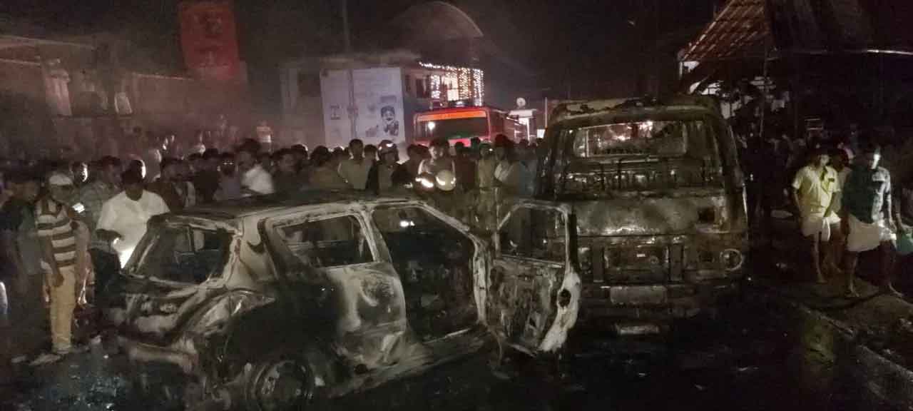 മലപ്പുറം ഭാഗത്തേക്ക് പോകുകയായിരുന്ന കാർ കോട്ടക്കല് ഭാഗത്തേക്ക് പോകുകയായിരുന്ന ടിപ്പര്ലോറിയുമ ായി കൂട്ടിയിടിക്കുകയായിരുന്നു. ഇടിയുടെ ആഘാതത്തില് ഇരുവാഹനങ്ങളും പൂര്ണമായും കത്തിനശിച്ചു.