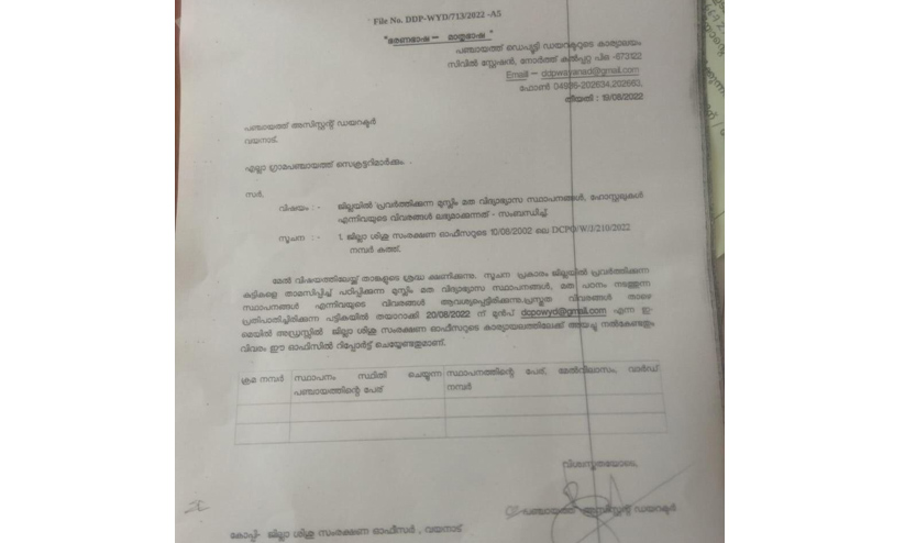 ജില്ലയിൽ കുട്ടികളെ താമസിപ്പിച്ച് പഠിപ്പിക്കുന്ന മുസ്ലിം മത വിദ്യാഭ്യാസ സ്ഥാപനങ്ങൾ, മത പഠനം നടത്തുന്ന സ്ഥാപനങ്ങൾ എന്നിവയുടെ വിവരങ്ങളാണ് അവശ്യപ്പെട്ടിരിക്കുന്നത്. ആഗസ്റ്റ് 20നു മുമ്പായി ഇ-മെയിൽ വഴി വിവരങ്ങൾ ജില്ല ശിശു സംരക്ഷണ ഓഫിസറുടെ കാര്യാലയത്തിലേക്ക് അയക്കണമെന്നും സർക്കുലറിൽ പറയുന്നു. ഒരു പ്രത്യേക മത വിഭാഗത്തിലെ സ്ഥാപനങ്ങളുടെ വിവരങ്ങൾ മാത്രം ശേഖരിക്കുന്നതിന് നിർദേശം നൽകിയതിലെ ദുരൂഹത ചൂണ്ടികാട്ടി മുസ്ലിം യൂത്ത് ലീഗ് ജില്ല കമ്മിറ്റി പ്രതിഷേധവുമായി രംഗത്തെത്തി.
