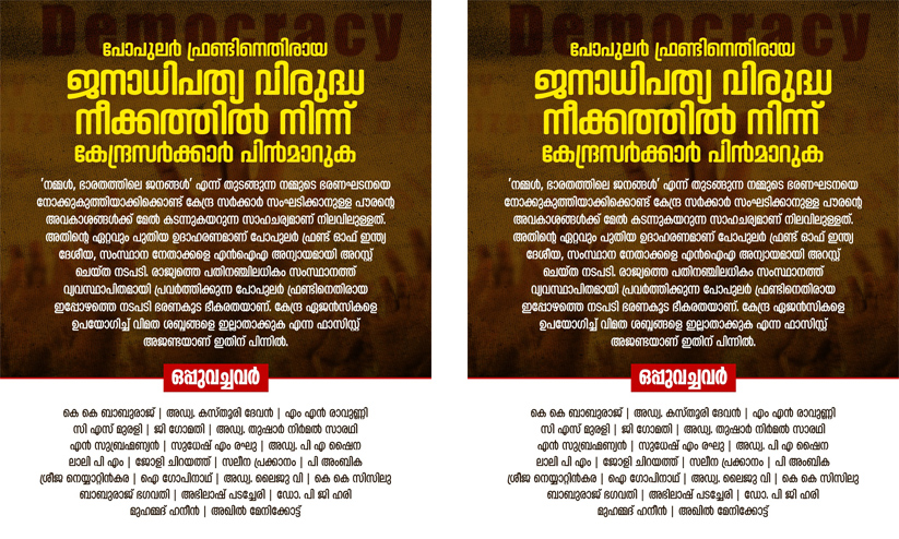 കേന്ദ്ര സര്ക്കാരിന്റെ നീക്കങ്ങള് ഏതെങ്കിലും ഒരു സംഘടനയെ മാത്രം പ്രതിക്കൂട്ടില് നിര്ത്തുന്നതല്ല. മറിച്ചു വിയോജിക്കുന്ന ഏത് പ്രതിപക്ഷ രാഷ്ട്രീയ പാര്ട്ടിയുടെ ഏറ്റവും വലിയ നേതാവിനേയും എപ്പോള് വേണമെങ്കിലും എങ്ങനെ വേണമെങ്കിലും കൈകാര്യം ചെയ്യാവുന്ന ഫാസിസ്റ്റ് സംവിധാനമാണ്. ഡല്ഹി ആരോഗ്യ മന്ത്രിയെ തടവിലാക്കിയിട്ട് മാസങ്ങളായി. ഡല്ഹി, ബംഗാള്, ജാര്ഖണ്ഡ്, ബിഹാര് തുടങ്ങിയ ബി.ജെ.പി ഇതര സംസ്ഥാനത്തെല്ലാം പ്രതിപക്ഷ പാര്ട്ടികളുടെ നേതാക്കള്ക്ക് നേരേ റെയ്ഡ് യുദ്ധം ഇപ്പോഴും നടക്കുന്നുണ്ട്. സോണിയാ ഗാന്ധിയേയും രാഹുല് ഗാന്ധിയേയും ഇ.ഡി കേസ് കൊണ്ട് വേട്ടയാടുകയാണ്. പോപുലര് ഫ്രണ്ടിനെതിരേ നടക്കുന്ന കേന്ദ്രസര്ക്കാര് നീക്കം ഇതിന്റെ തുടര്ച്ചയായേ കാണാന് സാധിക്കൂ. ഭരണകൂടം ഈ വേട്ടയില് നിന്ന് പിന്മാറണമെന്നും കേന്ദ്ര സര്ക്കാരിന്റെ രാഷ്ട്രീയ താല്പര്യാര്ത്ഥം തടവിലിട്ടിരിക്കുന്ന മുഴുവന് രാഷ്ട്രീയ തടവുകാരേയും അടിയന്തിരമായി നിരുപാധികം വിട്ടയക്കണമെന്നും ഞങ്ങള് ആവശ്യപ്പെടുന്നു -പൗരാവകാശ പ്രമുഖർ ഒപ്പുവെച്ച കുറിപ്പിൽ പറയുന്നു.