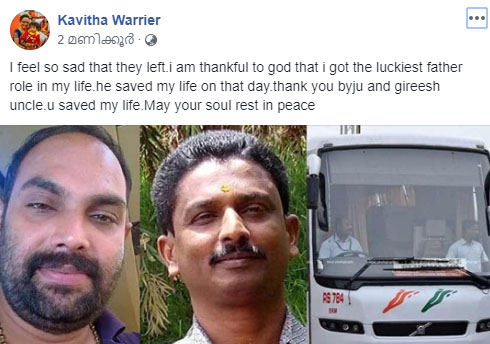 ‘ഈ വേർപാട് താങ്ങാവുന്നതിലപ്പുറമാണ്. ആ ദിനത്തിൽ സുകൃതം ചെയ്ത ‘പിതാവിനെ’ ലഭിച്ചതിന് ഞാൻ ദൈവത്തോട് ഏറെ കടപ്പെട്ടിരിക്കുന്നു. ബൈജു, ഗീരീഷ് നിങ്ങളാണ് അന്ന് എെൻറ ജീവൻ രക്ഷിച്ചത്’... അവിനാശിയിലെ അപകട വിവര മറിഞ്ഞ ആ പഴയ യാത്രക്കാരി കവിത വാര്യര് ഫെയ് സ് ബുക്കിൽ കുറിച്ചതാണിത്.