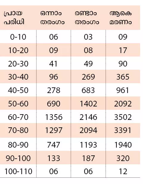 ഒന്നാംതരംഗത്തെ അപേക്ഷിച്ച് രണ്ടാംതരംഗത്തിൽ 30നും 60നും ഇടക്ക് പ്രായക്കാരിൽ മരണം കൂടി. 30 മുതൽ 40 വയസ്സ് വരെ ആദ്യതരംഗത്തിൽ 96 മരണമായിരുന്നെങ്കിൽ രണ്ടാംതരംഗത്തിൽ 269 ആണ്. നിരക്ക് 2.06ൽനിന്ന് 3.35 ആയാണ് ഉയർന്നത്. 40നും 50നും ഇടയിൽ 278 ആയിരുന്ന മരണം 683 ആയാണ് ഉയർന്നത്. നിരക്ക് 5.97ൽനിന്ന് 8.5 ആയി.