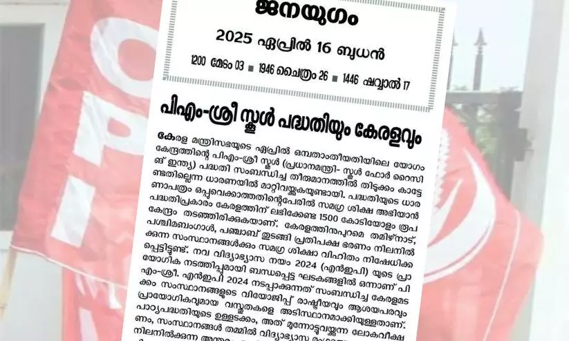 പി.എം ശ്രീയുടെ ധാരണാപത്രം ഒപ്പുവെക്കാത്തതിന്റെ പേരിൽ സമഗ്ര ശിക്ഷ അഭിയാൻ പദ്ധതി പ്രകാരം കേരളത്തിന് ലഭിക്കേണ്ട 1500 കോടിയോളം രൂപ കേന്ദ്രം തടഞ്ഞിരിക്കുകയാണെന്നും ജനയുഗം മുഖപ്രസംഗത്തിൽ പറയുന്നു. ദേശീയ വിദ്യാഭ്യാസ നയം നടപ്പാക്കുന്നതിന്റെ ഘടകങ്ങളിലൊന്നാണ് പി.എം ശ്രീ പദ്ധതി. എൻ.ഇ.പി നടപ്പാക്കുന്നത് സംബന്ധിച്ച് കേരളമടക്കമുള്ള സംസ്ഥാനങ്ങളുടെ വിയോജിപ്പ് രാഷ്ട്രീയവും ആശയപരവും പ്രായോഗികവുമായ വസ്തുതകളെ അടിസ്ഥാനമാക്കിയുള്ളതാണെന്നും മുഖപ്രസംഗത്തിൽ പറയുന്നു.