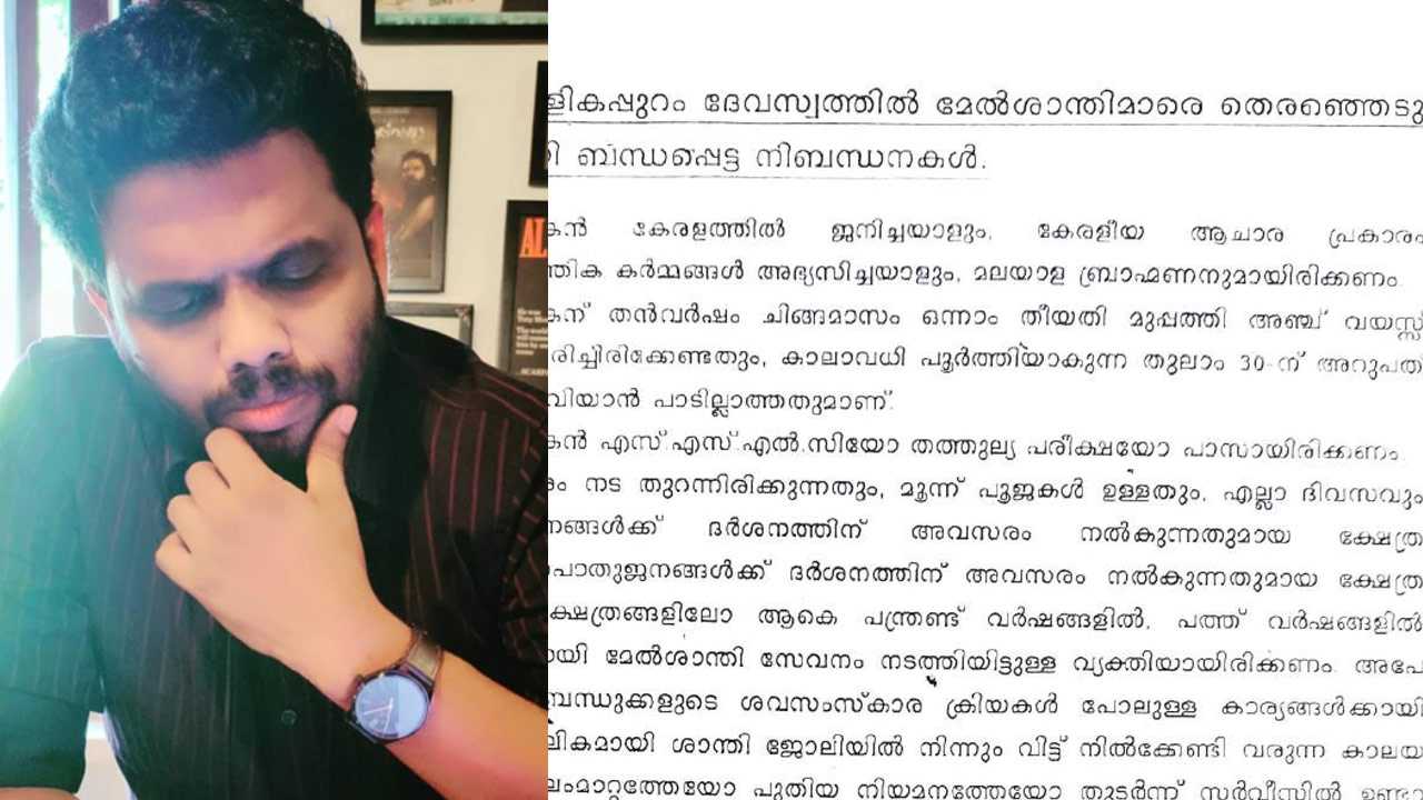 "അപേക്ഷകൻ കേരളത്തിൽ ജനിച്ചയാളും കേരളീയ ആചാര പ്രകാരം പൂജാ താന്ത്രിക കർമ്മങ്ങൾ അഭ്യസിച്ചയാളും മലയാള ബ്രാഹ്മണനുമായിരിക്കണം" എന്നാണ് ഒന്നാമത്തെ നിബന്ധനയായി വിജ്ഞാപനത്തിൽ പറയുന്നത്. തന്ത്രി - ശാന്തി നിയമനങ്ങളിൽ ജാതിവിവേചനം പാടില്ലെന്ന ഉത്തരവ് നിലനിൽക്കേ, ശബരിമല മേൽശാന്തിയായി ബ്രാഹ്മണ സമുദായക്കാരെ മാത്രം നിയമിക്കാനുള്ള നീക്കമാണ് വിവാദമാകുന്നത്.