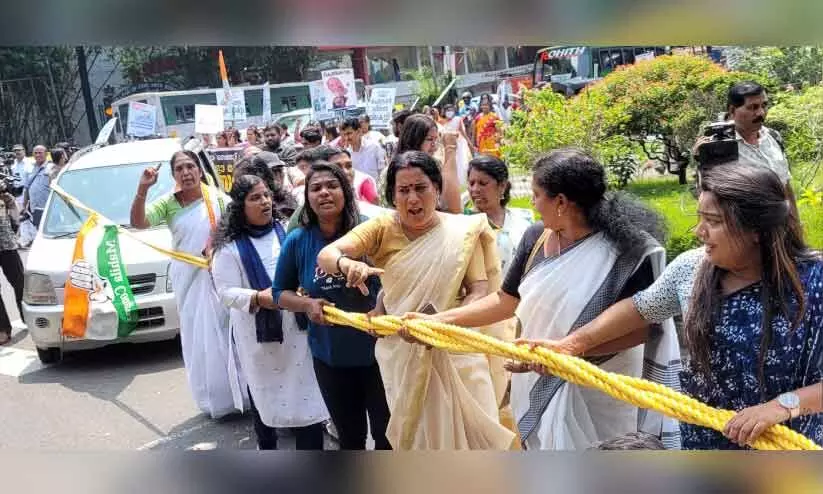 നടത്തിയ നിയമസഭ മാർച്ചിൽ കാർ കെട്ടിവലിച്ച് പ്രതിഷേധിക്കുന്ന വനിത പ്രവർത്തകർ