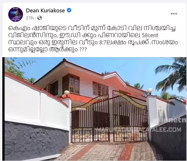 "കെ.എം ഷാജിയുടെ വീടിന് മുന്ന് കോടി വില നിശ്ചയിച്ച വിജിലൻസിനും ഇ.ഡിക്കും പിണറായിലെ 58 സെന്റ് സ്ഥലവും ഒരു ഇരുനില വീടും 8.7 ലക്ഷം രൂപക്ക്. സംശയം ഒന്നുമില്ലല്ലോ ആർക്കും ???" -എന്നാണ് ഡീൻ ഫേസ്ബുക്കിൽ കുറിച്ചത്.