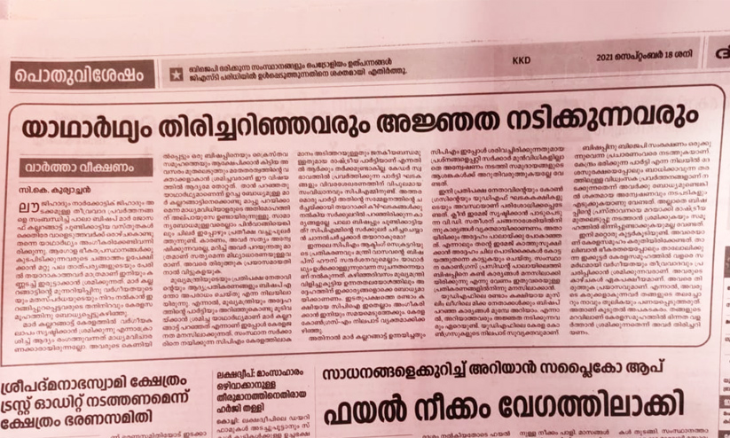 text_fieldsകോഴിക്കോട്: പാലാ ബിഷപ്പ് ഉന്നയിച്ച കാര്യങ്ങൾ സി.പി.എം ശരിവെച്ചെന്ന് ചൂണ്ടിക്കാട്ടി സീറോ മലബാർ സഭ മുഖപത്രം ദീപികയിൽ ലേഖനം. സി.പി.എം ആക്ടിങ് സെക്രട്ടറിയുടെ പ്രതികരണവും മന്ത്രി വി.എൻ. വാസവന്റെ പാലാ ബിഷപ്പ് ഹൗസ് സന്ദർശനവും എല്ലാം യാഥാർഥ്യം ഉൾക്കൊള്ളുന്നു എന്നതിന്റെ സൂചനയാണ്. മുഖ്യമന്ത്രി വിളിച്ചു കൂട്ടിയ ഉന്നതലയോഗത്തിൽ നിന്നും അദ്ദേഹത്തിന് കാര്യങ്ങൾ ബോധ്യമായി കാണണം. ബിഷപ്പ് ജോസഫ് കല്ലറങ്ങാട്ട് ഉന്നയിച്ചതും സി.പി.എം ശരിവെച്ചതുമായ പ്രശ്നങ്ങളിൽ സർക്കാർ മുൻവിധികളില്ലാതെ അന്വേഷണം നടത്തി സമുദായങ്ങളുടെ ആശങ്കകൾക്ക് അറുതി വരുത്തുകയല്ലേ വേണ്ടതെന്നും 'യാഥാർഥ്യം തിരിച്ചറിഞ്ഞവരും അജ്ഞത നടക്കുന്നവരും' എന്ന തലക്കെട്ടിൽ സി.കെ. കുര്യാച്ചൻ എഴുതിയ ലേഖനത്തിൽ പറയുന്നു.