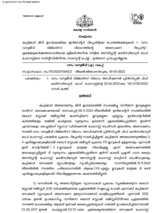 കപ്രിക്കാട് മിനി മൃഗശാലയിലെ രജിസ്റ്ററിലെ പൊരുത്തക്കേട് : അസി. കൺസർവേറ്ററെ സസ്പന്റെ് ചെയ്തു