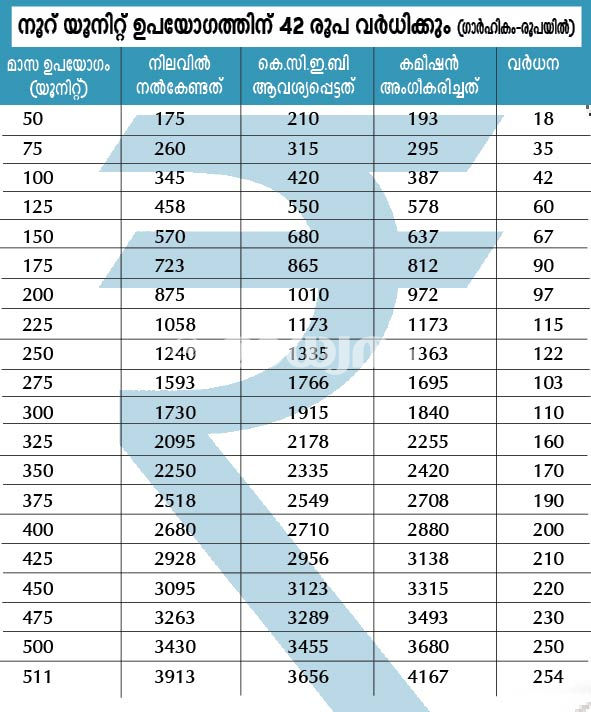 1 -50 വരെ നിലവിൽ 2.90-ബോർഡ് ആവശ്യം 3.50 രൂപ-കമീഷൻ അംഗീകരിച്ചത് 3.15, വർധന 25 പൈസ