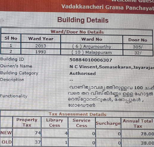 text_fieldsെചക്ക്പോസ്റ്റ് പ്രവർത്തിച്ച, പ്രതി വി.വി. സോമശേഖരെൻറ കൂട്ടുടമസ്ഥതയിലുള്ള കെട്ടിടത്തിെൻറ നികുതി രസീത്
