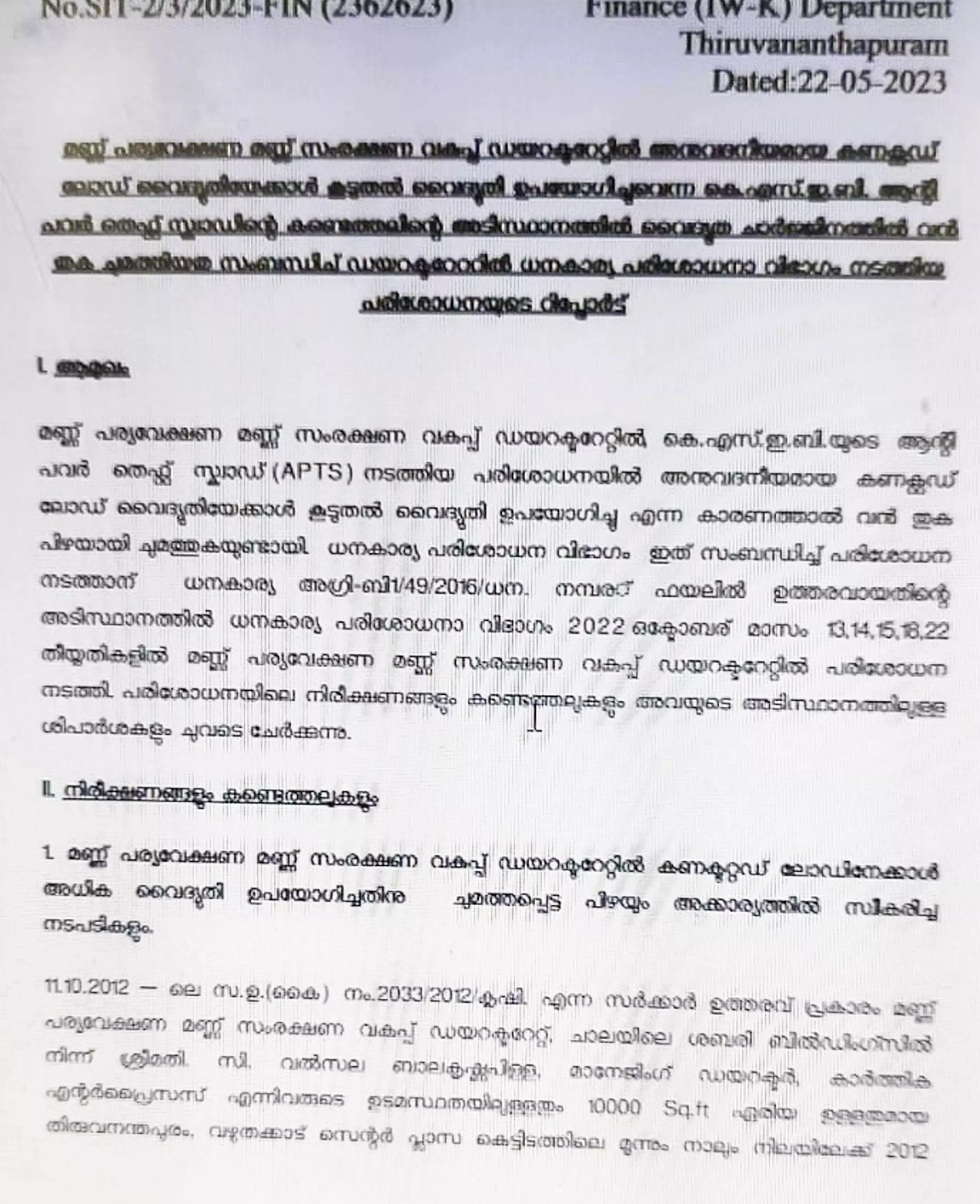 text_fieldsതിരുവനന്തപുരം: മണ്ണ് പര്യവേക്ഷണം ഡയറക്ടറേറ്റിലെ ഉദ്യോഗസ്ഥർക്കെതിരെ നടപടിയെടുക്കണമെന്ന് ധനകാര്യ പരിശോധനാ വിഭാഗത്തിന്റെ ശുപാർശ. ഡയറക്ടറേറ്റിലെ ഉദ്യോഗസ്ഥരുടെ കെടുകാര്യസ്ഥതയിൽ വൈദ്യുതി ചാർജിനത്തിൽ ഖജനാവിനുണ്ടായ നഷ്ടം 15.53 ലക്ഷമാണ്. കെ.എസ്.ഇ.ബി യുടെ ആൻഡി പവർ തെഫ്ട് സ്ക്വാഡ് പിഴ ചുമത്തിയപ്പോൾ തന്നെ വൈദ്യുതി കണക്ടഡ് ലോഡ് ഉയർത്തി ക്രമീകരിച്ചിരുന്നെങ്കിൽ സർക്കാർ ഖജനാവിൽനിന്ന് ഈ തുക നഷ്ടപ്പെടുമായിരുന്നില്ലെന്ന് റിപ്പോർട്ടിൽ വ്യക്തമാക്കി.
