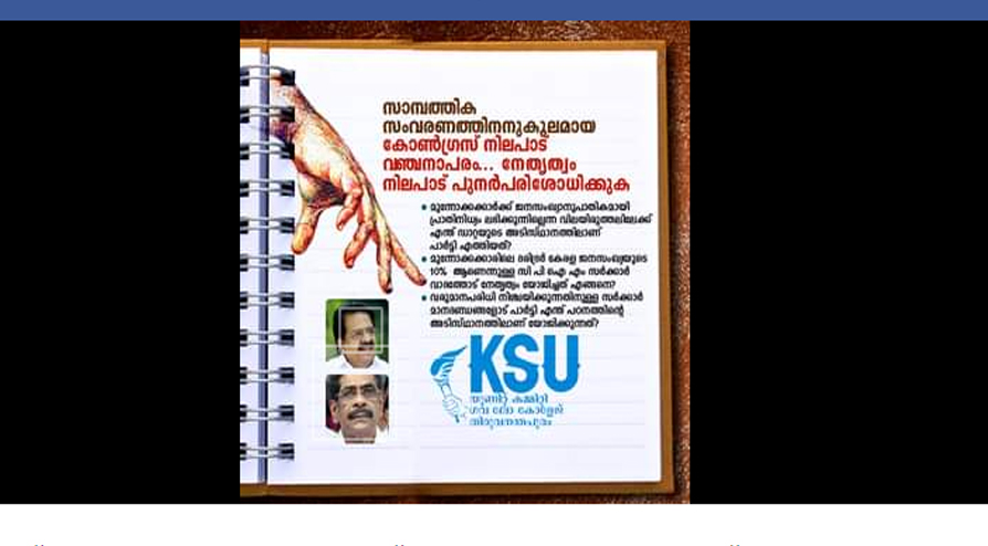 text_fieldsഇടതുപക്ഷ സർക്കാർ നടപ്പിലാക്കിയ സാമ്പത്തിക സംവരണത്തെ ഇരുകൈയും നീട്ടി സ്വീകരിച്ച കോൺഗ്രസ് നേതൃത്വത്തിനെതിരെ കെ.എസ്.യു തിരുവനന്തപുരം ലോ കോളജ് യൂണിറ്റ്. മുന്നാക്ക സംവരണത്തിൽ കോൺഗ്രസ്സിൻെറ നിലപാട് പൂർണമായും തെറ്റാണെന്ന് രേഖപ്പെടുത്താതെ കാലം കടന്ന് പോവില്ലെന്നും ഈ നിലപാടിൻെറ കറ എത്ര കഴുകിയാലും കോൺഗ്രസിൻെറ കയ്യിൽ നിന്ന് മായുകയില്ലെന്നും ലോ കോളേജ് യൂണിറ്റ് ഭാരവാഹികൾ ഫേസ്ബുക്കിൽ കുറിച്ചു.