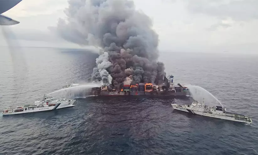കപ്പലിലെ തീ ശമിച്ചിട്ടില്ല, വശങ്ങളിലേക്ക് പടരുന്നു; ഇന്ത്യൻ തീരത്ത് കൂടി പോകുന്ന കപ്പലുകൾക്ക് മുന്നറിയിപ്പ്