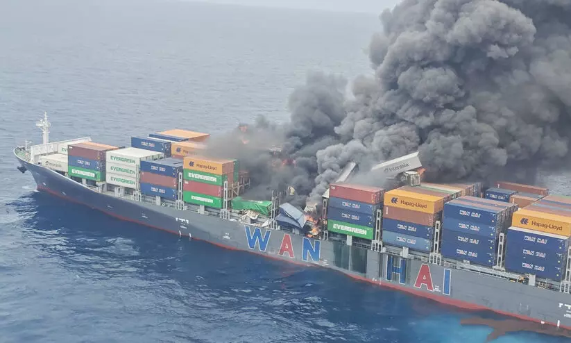 അണയാതെ തീ, കപ്പലിൽ 150ലേറെ കണ്ടെയ്നറുകളിൽ അപകടകരമായ വസ്തുക്കൾ; പരിക്കേറ്റ രണ്ടുപേരുടെ നില ഗുരുതരം