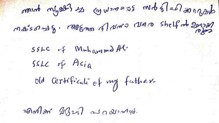 തന്റെയും ഭാര്യ ആസ്യയുടെയും എസ്.എസ്.എൽ.സി സർട്ടിഫിക്കറ്റും പിതാവിന്റെ സർട്ടിഫിക്കറ്റുകളും കൈയിൽ നിന്ന് നഷ്ടപ്പെട്ടതായാണ് ആത്മഹത്യാ കുറിപ്പിൽ പറയുന്നത്. വേസ്റ്റ് പേപ്പറിന്റെ കൂടെയാണ് രേഖകൾ നഷ്ടപ്പെട്ടതെന്നും നിങ്ങളും അപകടത്തിലാവുമെന്നും കുറിപ്പിൽ പറയുന്നു. തനിക്ക് വൈറസ് ബാധയേറ്റതായും ആത്മഹത്യ കുറിപ്പിൽ പറയുന്നുണ്ട്.
