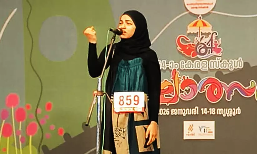 തൃശൂർ: അനീതികൾക്കെതിരായ വിരൽ ചൂണ്ടലായി സംസ്ഥാന സ്കൂൾ കലോത്സവ വേദിയിലെ അറബി കഥാപ്രസംഗ മത്സരത്തിലെ ഹംന നസ്റിന്റെ പ്രകടനം. ഫലസ്തീനിലെ മനുഷ്യർക്ക് മേൽ ഇസ്രായേൽ തീതുപ്പുന്നത് തുടരുമ്പോഴാണ് വല്ലപ്പുഴ ഹയർ സെക്കന്ററി വിദ്യാർഥിയായ ഹംനയുടെ കഥാപ്രസംഗത്തിന്റെ കാലികപ്രസക്തി.