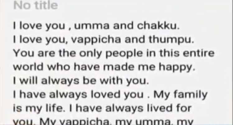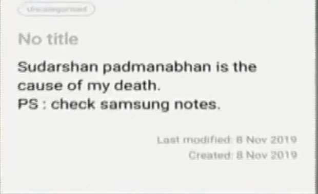 മരിച്ച ഫാത്തിമ ലത്തീഫിെൻറ ഫോണ ിൽ നിന്നും തെൻറ മരണത്തിന് കാരണം ഐ.ഐ.ടി പ്രൊഫസറായ സുദർശൻ പത്മനാഭനാണ് എന്ന് വ്യക്തമാക്കുന്ന കുറിപ്പ് കണ്ടെത്തിയിരുന്നു. എന്നാൽ അത്തരമൊരു ആത്മഹത്യ കുറിപ്പ് ലഭിച്ചില്ലെന്നായിരുന്നു പൊലീസ് നേരത്തെ അറിയിച്ചത്.