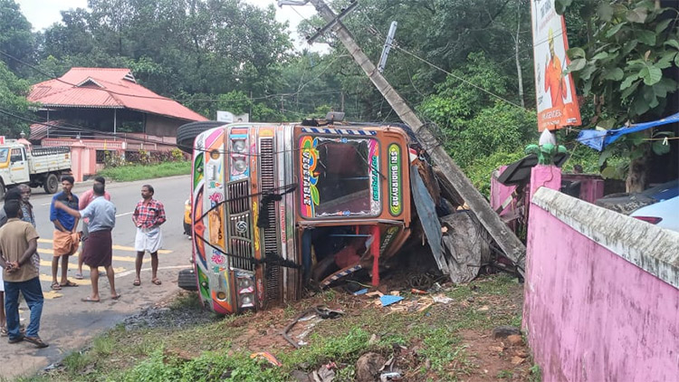 ഡ്രൈവര് ഉറങ്ങി പോയതാകാം അപകടത്തിന് കാരണമെന്ന് പൊലീസ് പറയുന്നു. ഇറക്കവും വളവും ചേര്ന്ന ഈ ഭാഗത്ത് നിയന്ത്രണം വിട്ട ലോറി രണ്ട് വൈദ്യുതി പോസ്റ്റുകള് തകര്ത്ത ശേഷം സമീപത്തെ വീട്ടിലെ മതിലില് ഇടിച്ചാണ് മറിഞ്ഞത്.
