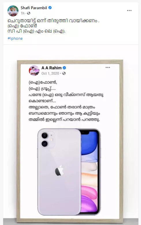 'ഐ' ഫോൺ എന്നാൽ സി.പി'ഐ'എമ്മിലെ 'ഐ' എന്ന് ഷാഫി ഫേസ്ബുക്കിൽ കുറിച്ചു. ചെറുതായിട്ട് ഒന്ന് തിരുത്തി വായിക്കണമെന്നും ഷാഫി പറമ്പിൽ ആവശ്യപ്പെടുന്നുണ്ട്. കൂടാതെ, മുമ്പ് ഐ ഫോൺ വിവാദ കാലത്ത് ഐ ഗ്രൂപ്പിനെതിരെ ആരോപണം ഉന്നയിച്ച് ഇട്ട പോസ്റ്റിന്റെ സ്ക്രീൻ ഷോട്ടും ഷാഫി ഫേസ്ബുക്കിൽ ഷെയർ ചെയ്തിട്ടുണ്ട്.