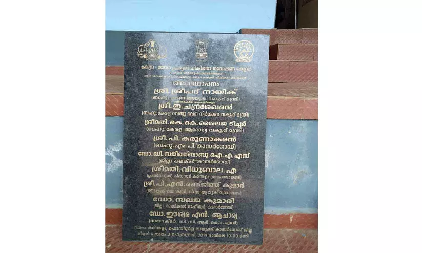 100 കിടക്കകളോടുകൂടിയുള്ള യോഗ പ്രകൃതിചികിത്സ ആശുപത്രിയുടെ ഉദ്ഘാടന മാമാങ്കം നടത്തിയ തറക്കല്ല് പാറപ്പുറത്ത് കാടുമൂടിയും ശിലാഫലകം കിനാനൂർ കരിന്തളം പഞ്ചായത്ത് ഓഫിസിൽ പൊടിപിടിച്ചും കിടക്കുന്നു. 2019 ഫെബ്രുവരി മൂന്നിന് കേന്ദ്ര ആയുഷ് മന്ത്രി ശ്രീപദ് നായിക്കാണ് തറക്കല്ലിടൽ ചടങ്ങ് ഉദ്ഘാടനം ചെയ്തത്. ആരോഗ്യ മന്ത്രിയായിരുന്ന കെ.കെ. ശൈലജയാണ് അധ്യക്ഷത വഹിച്ചത്. ഒന്നാം എൻ.ഡി.എ സർക്കാറിന്റെ കാലത്തായിരുന്നു പദ്ധതി പ്രഖ്യാപിച്ചതും തറക്കല്ലിട്ടതും.