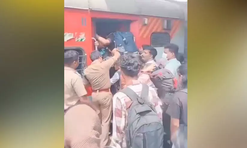 text_fieldsനിറഞ്ഞുകവിഞ്ഞ കോച്ചുകൾക്കുള്ളിൽ കയറിപ്പറ്റാനുള്ള യാത്രക്കാരുടെ ശ്രമത്തെ റെയിൽവേ പൊലീസ് തടയുന്നു