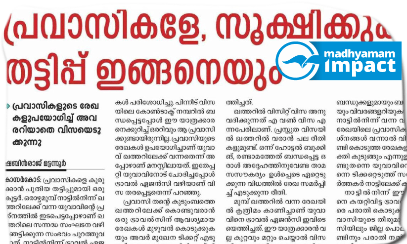 text_fieldsകാസർകോട്: വിസിറ്റ് വിസ തട്ടിപ്പിനിറങ്ങിയവർക്കെതിരെ പൊലീസ് കേസെടുത്തു. പ്രവാസികളെ കൃത്രിമ രേഖയിൽ ഖത്തറിൽ എത്തിക്കുന്ന ട്രാവൽ ഏജൻസിക്കെതിരെയാണ് കേസെടുത്തത്. ഒരുമാസം മുമ്പ് ഖത്തറിലേക്ക് പോയ യുവാവിന്റെ പ്രശ്നത്തിൽ ഇടപെട്ട സന്നദ്ധസംഘടനവഴിയാണ് ഞെട്ടിക്കുന്ന സംഭവം പുറത്തുവന്നിരുന്നത്. ട്രാവൽ ഏജൻസി മുഖേന വിസയെടുത്ത് പുറത്തേക്കുപോയ യുവാവ് താമസത്തിനും മറ്റും വേണ്ടി മലയാളികളെ സമീപിച്ചപ്പോഴാണ് ട്രാവൽസിന്റെ തട്ടിപ്പുവിവരം പുറത്തറിയുന്നത്. ഉളിയത്തടുക്കയിലെ ട്രാവൽ ഏജൻസി വഴി വിദേശത്ത് പോയയളുടെ രേഖകളും മറ്റും ഉപയോഗിച്ചാണ് തട്ടിപ്പ് നടന്നത്.