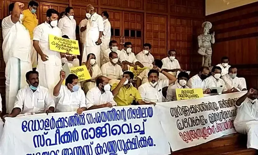 പ്രതിപക്ഷ അംഗങ്ങൾ നിയമസഭക്ക് പുറത്ത് കുത്തിയിരുന്ന് പ്രതിഷേധിക്കുന്നു
