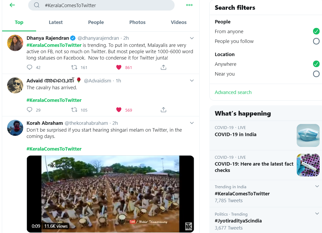 ഫേസ്ബുക്കും വാട്സ്ആപ്പും ഇൻസ്റ്റഗ്രാമും ടിക്ടോകും ഇല്ലാത്തവർ കേരളത്തിൽ ചുരുക്കമാണ്. ഇൗ സാഹചര്യത്തിൽ ട്വിറ്ററിലും ഒരു കൈ നോക്കാനുള്ള ഒരുക്കത്തിലാണ് മലയാളികൾ. രാഷ്ട്രീയ പ്രമുഖരും സാംസ്കാരിക-സിനിമാ പ്രവർത്തകരും വരെ പരസ്യമായി ചൂടേറിയ ചർച്ചകൾ നടത്തുന്ന ട്വിറ്ററിലേക്കുള്ള മലയാളികളുടെ കൂട്ടമായ വരവ് എന്തായാലും ആകാംക്ഷയേകുന്നതാണ്. യൂസർമാർ തമ്മിലുള്ള ഹാഷ്ടാഗ് മത്സരങ്ങൾക്ക് പേരുകേട്ട ട്വിറ്ററിൽ ഇനി മലയാളികളും വീറോടെ മുന്നിലുണ്ടാവും.