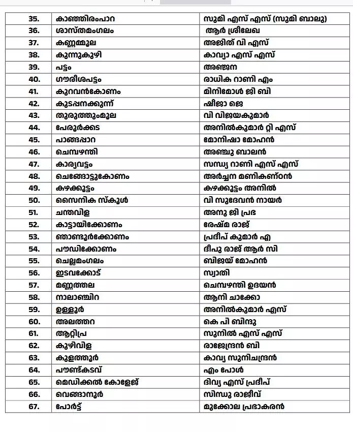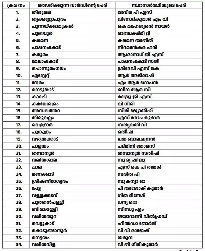 ഏഷ്യന് ഗെയിംസ് മെഡല് ജേതാവും സ്പോര്ട്സ് കൗണ്സില് സംസ്ഥാന പ്രസിഡന്റുമായിരുന്ന പത്മിനി തോമസ്, വി.വി. രാജേഷ് തുടങ്ങിയവർ പട്ടികയിൽ ഇടംപിടിച്ചിട്ടുണ്ട്. കോണ്ഗ്രസ് അംഗമായിരുന്ന പത്മിനി തോമസ് കഴിഞ്ഞ വർഷമാണ് ബിജെപിയില് ചേർന്നത്.