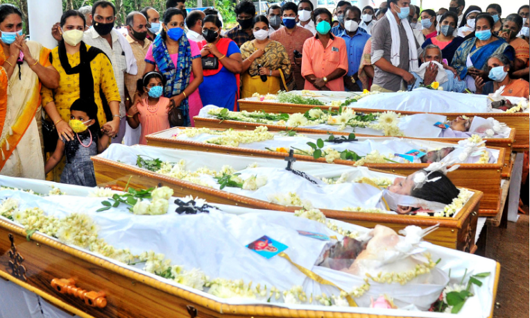 കൂട്ടിക്കല് (കോട്ടയം): ഉരുൾജലം തുടച്ചുനീക്കിയ ആ കുടുംബത്തിലെ ഓരോ അംഗങ്ങളെയും വഹിച്ച് കാവാലി മലമുകളിലെ പള്ളിയിലേക്ക് ആംബുലൻസുകൾ കയറിവരുന്ന കാഴ്ച തന്നെ നെഞ്ചുലക്കുന്നതായിരുന്നു. ദുരന്തം ഇല്ലാതാക്കിയ ഒട്ടലാങ്കല് കുടുംബത്തിലെ ക്ലാരമ്മ, മകന് മാര്ട്ടിന്, ഭാര്യ സിനി, മക്കളായ സാന്ദ്ര, സ്നേഹ, സോന എന്നിവരുടെ ചേതനയറ്റ ശരീരങ്ങൾ കാവാലി സെൻറ് മേരീസ് പള്ളിയങ്കണത്തിൽ അന്ത്യശുശ്രൂഷകൾക്കായി എത്തിച്ചപ്പോൾ നാട്ടുകാർ തേങ്ങലോടെ ഏറ്റുവാങ്ങി. രണ്ടാഴ്ചമുമ്പുവരെ കുര്ബാനക്കെത്തിയിരുന്ന ഈ കുടുംബത്തെ നിശ്ചലമായി പള്ളിയങ്കണത്തില് കിടത്തിയപ്പോള് അന്ത്യോപചാരമര്പ്പിക്കാനെത്തിയവർ വിതുമ്പുന്നുണ്ടായിരുന്നു.