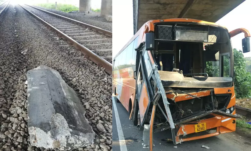text_fieldsഅപകടത്തിൽപെട്ട ബസും, റെയിൽപാളത്തിലേക്ക് വീണ കോൺക്രീറ്റ് പാളിയും