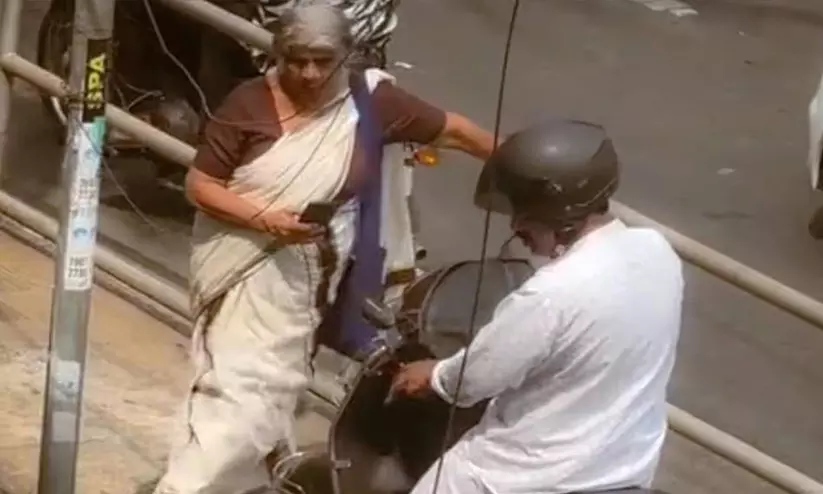 ജങ്ഷനിലെ തിരക്ക് മറികടക്കാൻ റോഡിൽ നിന്ന് ഫുട്പാത്തിലൂടെ സ്കൂട്ടർ ഓടിക്കുകയായിരുന്നു. തന്റെ മുന്നിലെത്തിയ യാത്രികനെ പ്രഭാവതി അമ്മ തടഞ്ഞു. പലതവണ മറികടക്കാൻ സ്കൂട്ടർ യാത്രികൻ ശ്രമിച്ചെങ്കിലും സ്കൂട്ടറിന്റെ മുന്നിൽ നിന്ന് മാറാതെ പ്രഭാവതിയമ്മയും നിന്നു. നിയമവിരുദ്ധ പ്രവൃത്തികൾ താൻ വിഡിയോയിൽ പകർത്തുമെന്ന് വീട്ടമ്മ ഭീഷണിപ്പെടുത്തിയതോടെ സ്കൂട്ടർ യാത്രികൻ പിന്തിരിഞ്ഞു പോവുകയായിരുന്നു. എന്നാൽ, സമീപത്തെ കെട്ടിടത്തിൽ നിന്ന് ഒരാൾ സംഭവം കാമറയിൽ പകർത്തിയിരുന്നു.