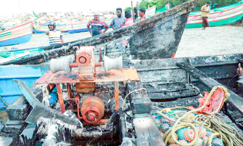 കരൂർ തീരത്ത് രണ്ട് മത്സ്യബന്ധന വള്ളങ്ങൾ കത്തിയ നിലയിൽ