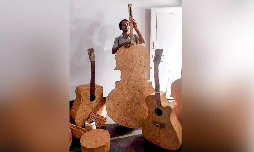 text_fieldsതാൻ നിർമിച്ച സംഗീതോപകരണ മാതൃകകൾക്കൊപ്പം ഷൈജു