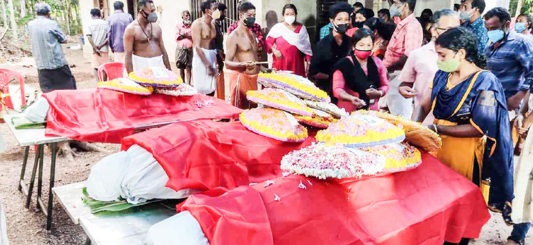 കത്തിക്കരിഞ്ഞതിനാൽ പ്രിയപ്പെട്ടവരുടെ മുഖം അവസാനമായി ഒരു നോക്ക് കാണാന്പോലും കഴിയാതെ ബന്ധുക്കളും നാട്ടുകാരും തേങ്ങി. ബന്ധുക്കളും നാട്ടുകാരും ജനപ്രതിനിധികളും രാഷ്ട്രീയ പാർട്ടി പ്രവർത്തകരും കുടുംബശ്രീ പ്രവർത്തകരും അടക്കമുള്ളവർ അന്ത്യോപചാരം അർപ്പിച്ചതോടെ മൃതദേഹങ്ങൾ ചിതയിലേക്കെടുത്തു.
