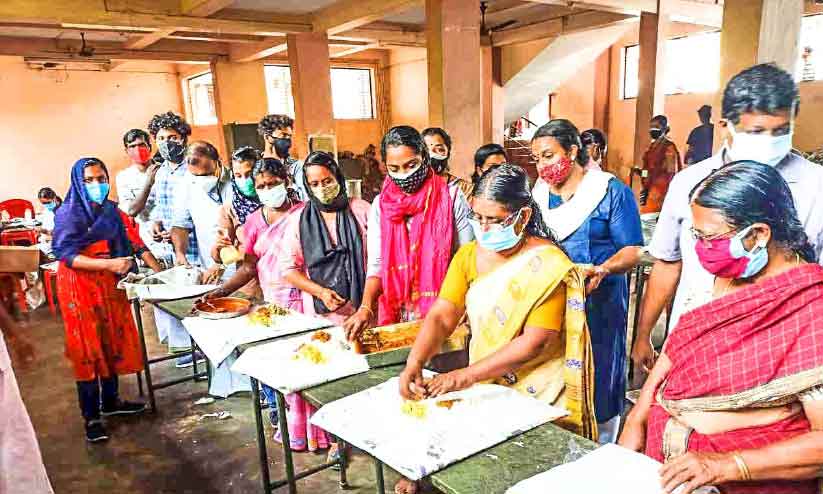 പതിവിൽനിന്ന് വ്യത്യസ്തമായി കൊഞ്ച് തീയൽ അടക്കമുള്ള വിഭവങ്ങളായിരുന്നു പ്രത്യേകത. രണ്ടായിരത്തോളം പേർക്ക് മൂന്നുനേരമാണ് സമൂഹ അടുക്കളയിൽനിന്ന് ഭക്ഷണം വിതരണം ചെയ്യുന്നത്.
