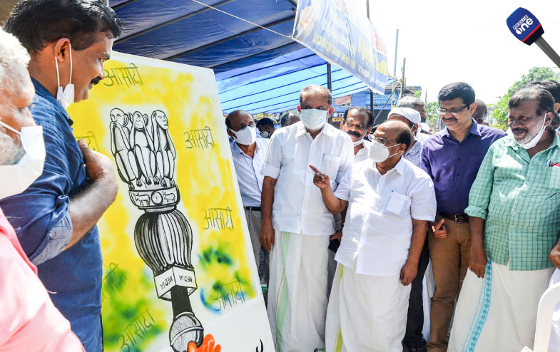 ആലപ്പുഴ: മീഡിയവൺ ചാനലിന് ഐക്യദാർഢ്യം പ്രഖ്യാപിച്ച് തത്സമയം ചിത്രമൊരുക്കി ദേശീയചിത്രകാരൻ. ആലപ്പുഴ കാവാലം വെളിയനാട് പള്ളോളിവീട്ടിൽ തോമസ് കുര്യനാണ് (47) മീഡിയവൺ വിലക്കിനെതിരെ പ്രതിഷേധ ചിത്രം പകർത്തിയത്. ആലപ്പുഴ കലക്ടറേറ്റ് ജങ്ഷനിൽ ബഹുജന അവകാശ സംരക്ഷണസമിതി സംഘടിപ്പിച്ച പ്രതിഷേധസംഗമത്തിന്റെ ഭാഗമായി ഒരുമണിക്കൂർ സമയമെടുത്താണ് ചിത്രം പൂർത്തീകരിച്ചത്. മീഡിയവൺ എഡിറ്റർ പ്രമോദ് രാമൻ, മുൻമന്ത്രി ജി. സുധാകരൻ എന്നിവർ ചേർന്ന് പൊന്നാട അണിയിച്ചു. പ്രധാനമന്ത്രി നരേന്ദ്ര മോദിയുടെ പ്രഭാഷണ പരിപാടിയായ മൻ കി ബാത്തിനെ അനുസ്മരിച്ച് 'മങ്കി ബാത്ത്' തലക്കെട്ടിൽ 'കാണരുത്, കേൾക്കരുത്, പറയരുത് 'കുരങ്ങുകളെയാണ് ചിത്രീകരിച്ചത്. മീഡിയവണിന്റെ നിരോധനം മാറ്റി രാജ്യത്ത് സ്വാതന്ത്ര്യത്തിന്റെ അന്തരീക്ഷം മുഴങ്ങണമെന്ന 'ആസാദി' സന്ദേശവും കാൻവാസിൽ കുറിച്ചിരുന്നു. വര പൂർത്തിയായപ്പോൾ വിശിഷ്ടാതിഥികൾ അടക്കമുള്ളവർ നിറഞ്ഞ കൈയടിയോടെയാണ് സ്വീകരിച്ചത്.