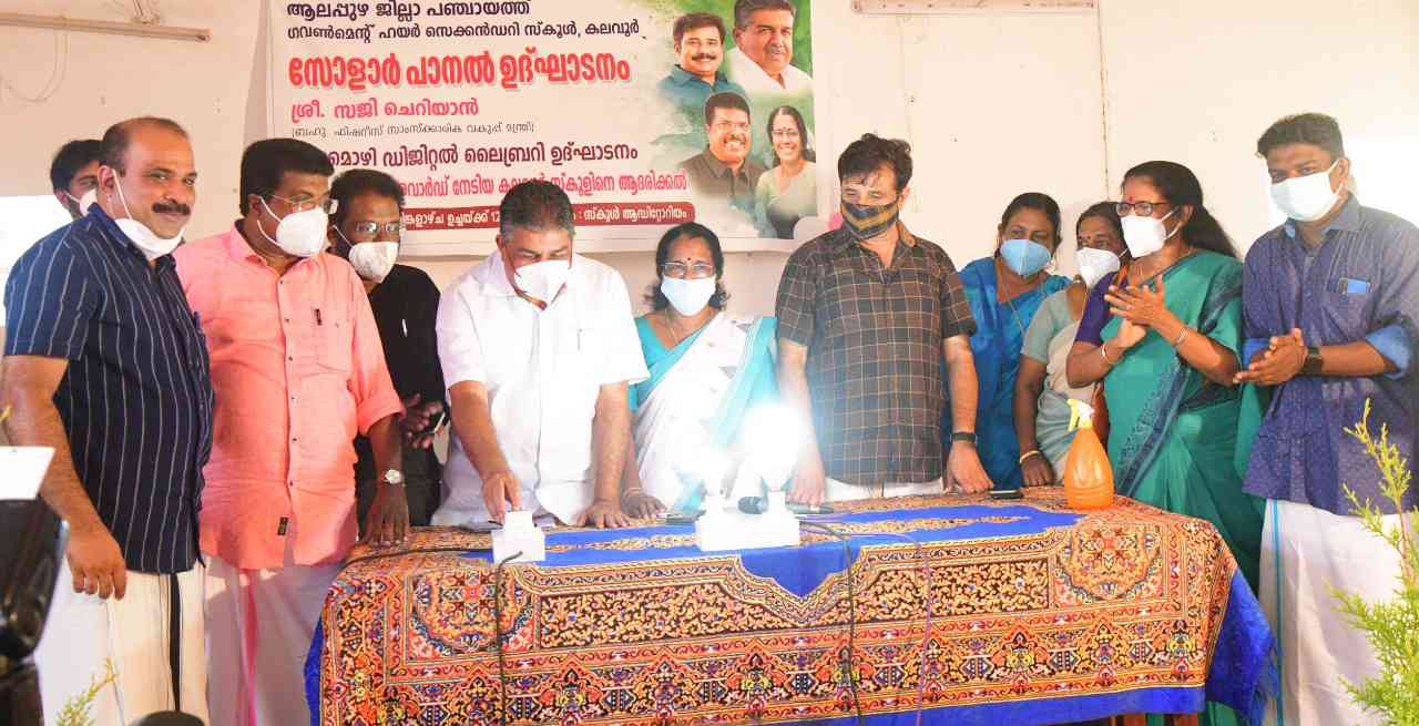 text_fieldsകലവൂർ ഗവണ്മെന്റ് ഹയർ സെക്കന്ററി സ്കൂളിൽ അനർട്ട് നിർമ്മിച്ച സോളാർ പാനലിന്റെ ഉദ്ഘാടനം മന്ത്രി സജി ചെറിയാൻ നിർവ്വഹിക്കുന്നു