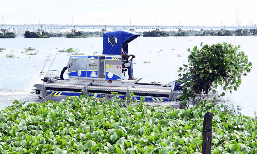 പായലിനെ പിടികൂടാൻ വീഡ് ഹാർവെസ്റ്റർ ‘കായലിലിറങ്ങി’