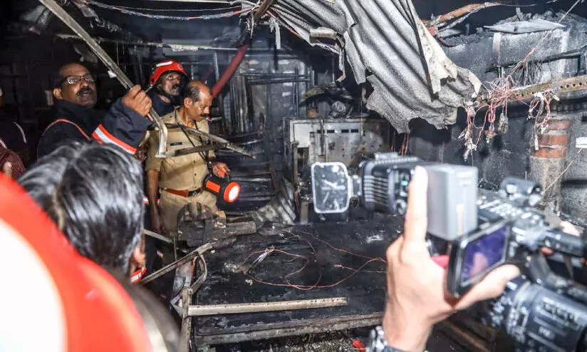 text_fieldsതീപിടിത്തമുണ്ടായ കടകളിൽ അഗ്നിരക്ഷസേനാ ഉദ്യോഗസ്ഥർ പരിശോധന നടത്തുന്നു