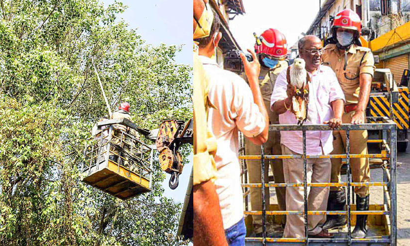ക്രെയിനിൽ കയറി തോട്ടി ഉപയോഗിച്ച് മുകേഷ് ജെയിൻ പരുന്തിനെ രക്ഷിക്കുന്നു, രക്ഷിച്ച പരുന്തുമായി മുകേഷ് ജെയിൻ