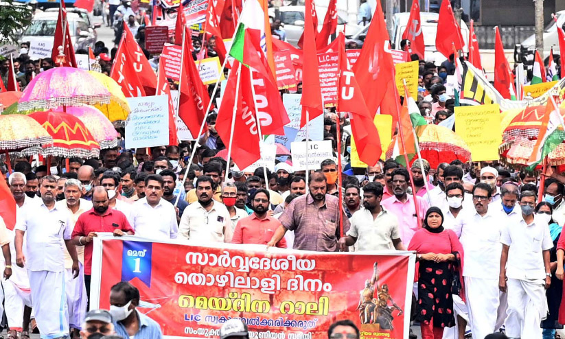 കൊച്ചി: തൊഴിലാളി ശക്തിയും ഐക്യവും വിളിച്ചോതി നാടെങ്ങും മേയ് ദിനാചരണം. പതാക ഉയർത്തലും റാലികളും സമ്മേളനങ്ങളും നടന്നു. തൊഴിൽ കേന്ദ്രങ്ങളിലും വ്യവസായസ്ഥാപനങ്ങൾക്കു മുന്നിലും പതാക ഉയർത്തി. കേന്ദ്രസർക്കാർ എൽ.ഐ.സി സ്വകാര്യവത്കരിക്കുന്നതിനെതിരെ എൽ.ഐ.സി സംരക്ഷണ പ്രതിജ്ഞയെടുത്താണ് തൊഴിലാളികൾ മേയ് ദിനം ആചരിച്ചത്. മണ്ഡലം കേന്ദ്രങ്ങളിലും പ്രധാന കേന്ദ്രങ്ങളിലും റാലിയും സമ്മേളനവും നടത്തി.