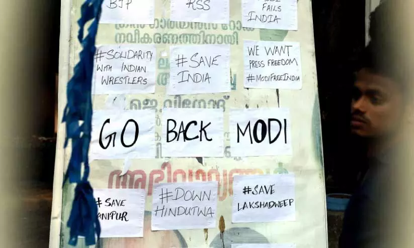 കൊച്ചി: കനത്ത സുരക്ഷ സംവിധാനങ്ങൾക്കിടയിലും പ്രധാനമന്ത്രി നരേന്ദ്ര മോദിയുടെ റോഡ് ഷോയുമായി ബന്ധപ്പെട്ട് വിവിധയിടങ്ങളിൽ യൂത്ത് കോൺഗ്രസ്, കെ.എസ്.യു പ്രതിഷേധം. എറണാകുളം ലോ കോളജിൽ കെ.എസ്.യു പ്രവർത്തകരുടെ നേതൃത്വത്തിൽ ‘മോദി ഗോ ബാക്ക്, ജനാധിപത്യം സംരക്ഷിക്കുക’ തുടങ്ങിയ ബാനറുയർത്തിയാണ് പ്രതിഷേധിച്ചത്.